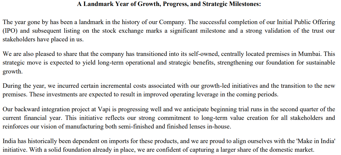 I feel making a comparison with Essilor or Zeiss, we should also consider that we are NOT paying a 40x pe to Yash (unlike brands like Zeiss or chains like Lenskart).