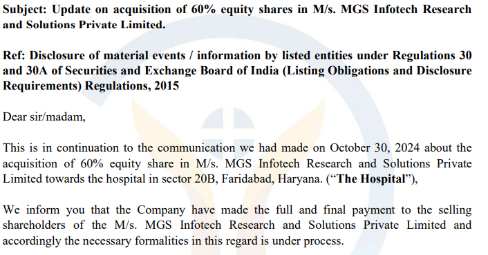 No the tax news was already digested IT department frozed just 70cr back in oct 23 and half of the amount is already released, the only issue that could happen is the land case for jhansi hospital that got stay order from the high court