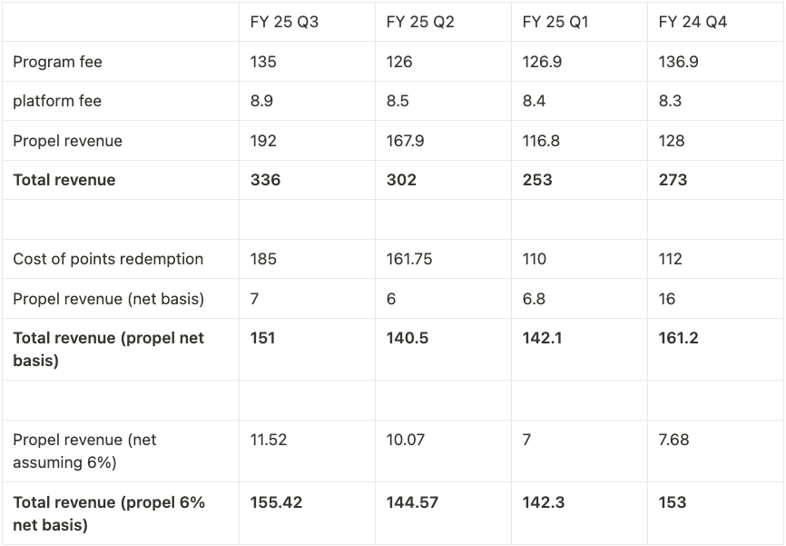 The key issue here seems to be the lack of an increase in program fees and platform fees, rather than an expansion of margins. Looking at Propel revenue on a net basis provides a clearer perspective. While Propel’s margins have declined even if they were to recover to 6%, as you noted, the overall impact would remain relatively limited. Revenue has essentially been flat over the year.