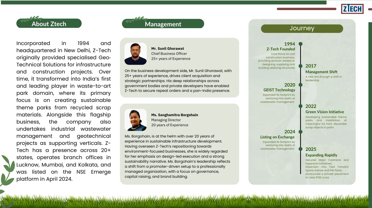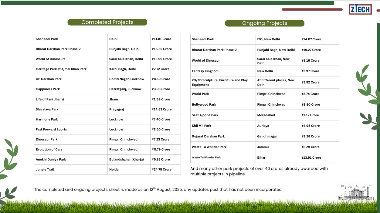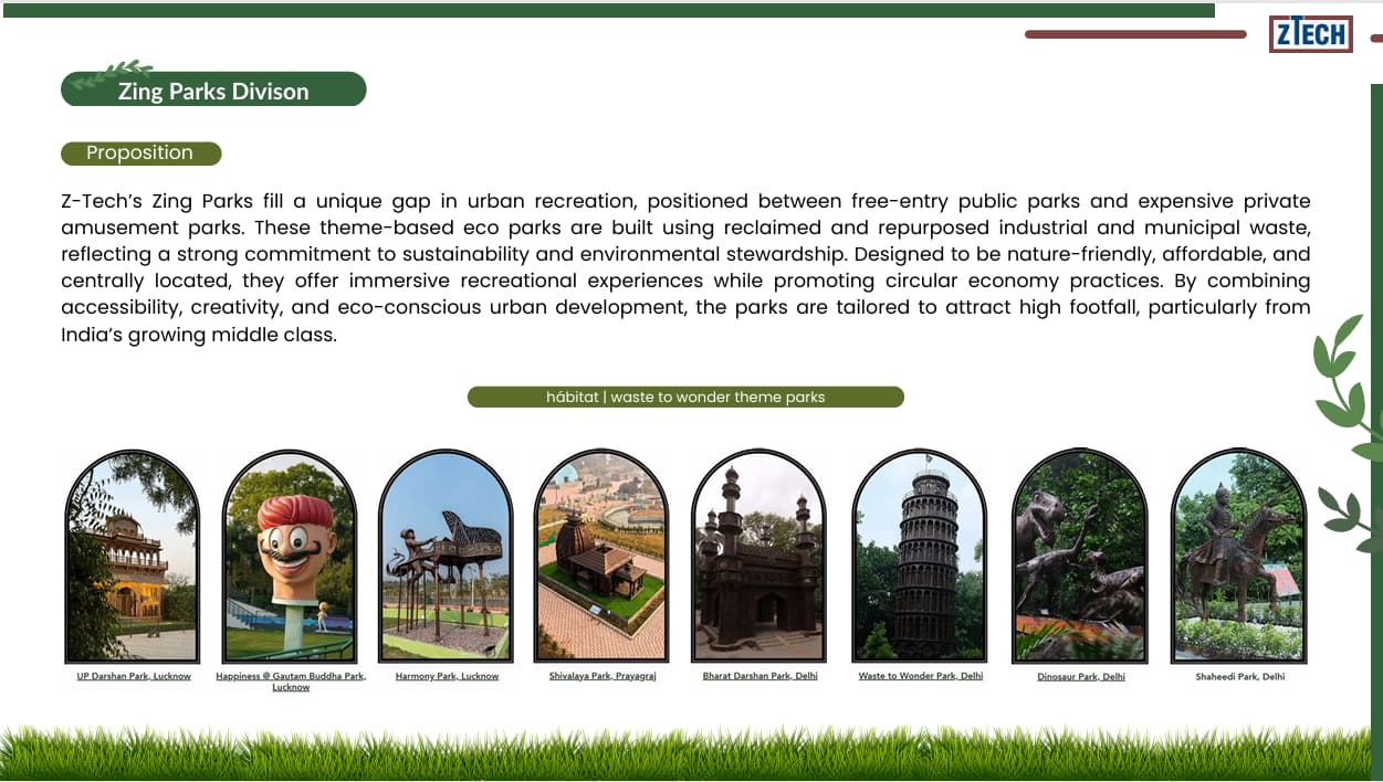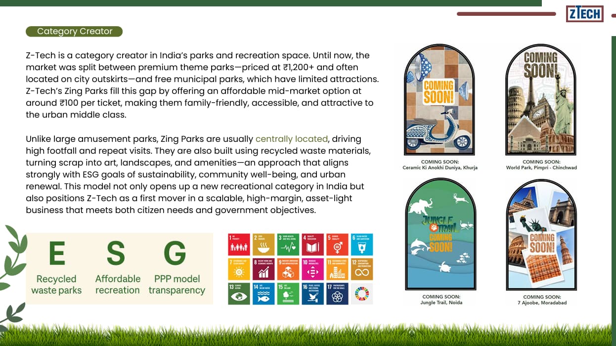 Expansion and Diversification: Z-Tech is actively pursuing geographical expansion, particularly in South India where it only has one park, and is exploring international opportunities, with active leads in Dubai. The company is also diversifying its offerings to include fast forward sports arenas, pet parks, and potentially Waste to Art Products.