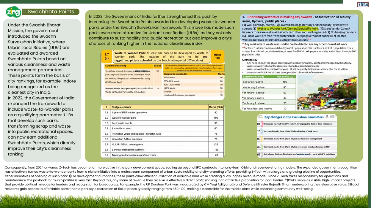 - The Waste to Wonder parks also help in securing points under Swachh Bharat Abhiyan marking scheme, which thus helps them secure funds from center.