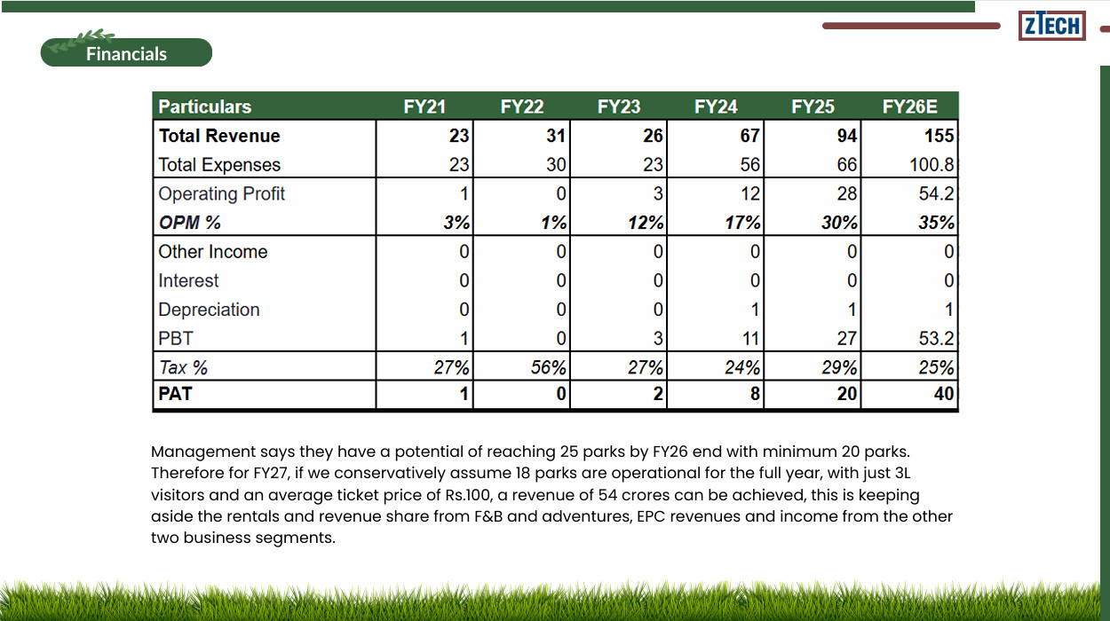 Here, when the EPC part of the revenue will start to stagnant the O&M will start to increase as a % of total revenue leading to growth in revenue majorly driven by growth in footfall and engagement of the park by starting various activities or so which is something will define the managements ability to create sustainability post the early years of EPC dominated revenue stream here, ticketing revenue won’t be able to increase at a rate at which businesses like Wonderla, Imagica, Nicco park did because here government is also involved so growth will be driven on increase in foot falls in this stage but margins will be higher as O&M expense as a percentage of O&M revenue will be pretty low.