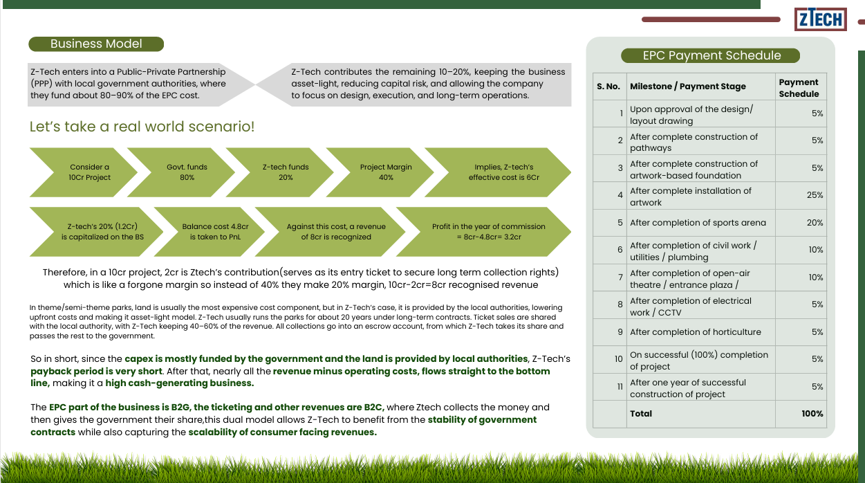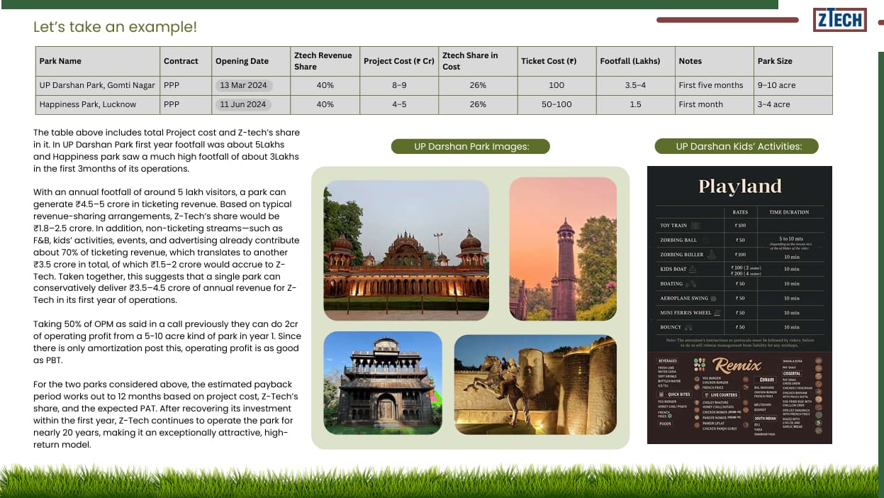 f) The beauty of this model is generally Land, which is most expensive factor of production is allotted by the government to build such park making this economically viable for the Company like Z Tech to come and even participate to operate the park with super return ratio. The local authorities will also facilitate the selection of land in locations with the potential to attract substantial footfall and support sustained revenue generation for the company.