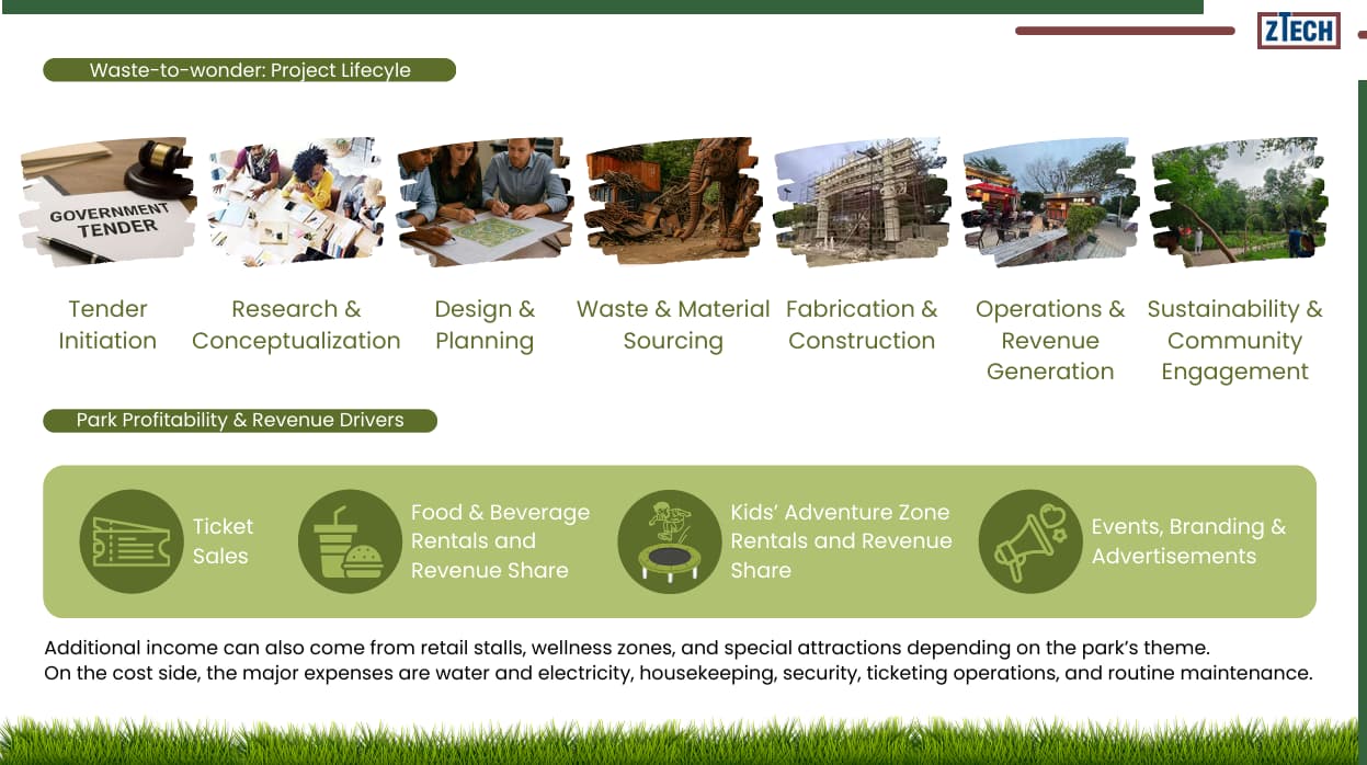 Z-Tech engages in the conceptualization, planning, design, construction, and operations management of theme parks with a strong emphasis on environmental sustainability. This includes creating artwork and infrastructure from waste materials, embodying the ‘From Waste to Wonder’ concept. The company utilizes models like EPC, Hybrid Annuity Model (HAM) and through investing its own funds and carry operations in collaboration with the government. Not only this, the Company operates and maintains the park and gives performance guarantee to the authority. This ensure economic sustainability of parks.